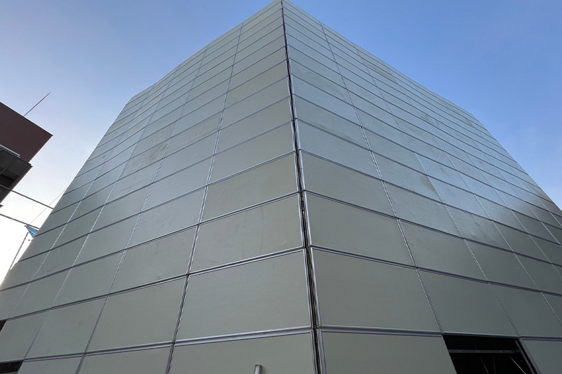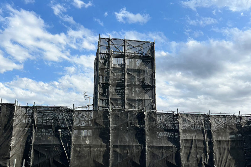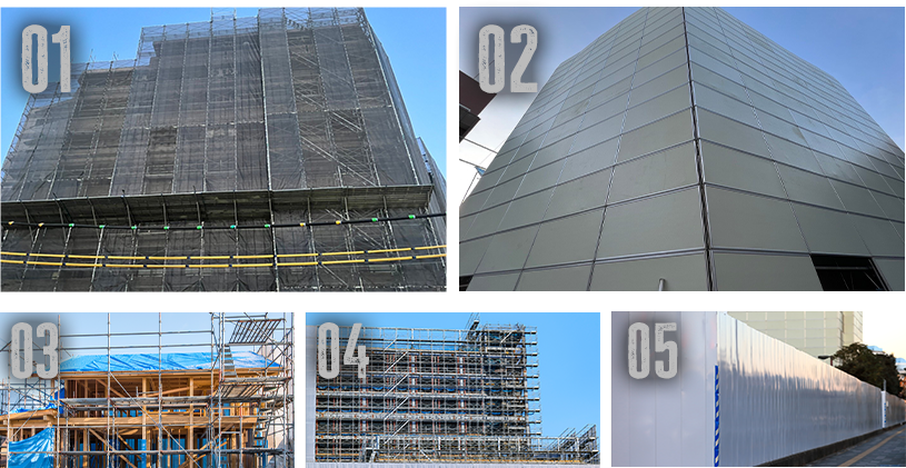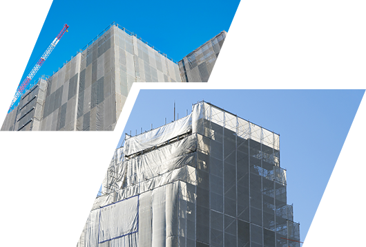 建設現場の足場で使用される、養生シート。主に建物全体をカバーしているシートを指します。養生を行うことで、周囲への影響を抑えたり作業者を保護したりすることが可能です。